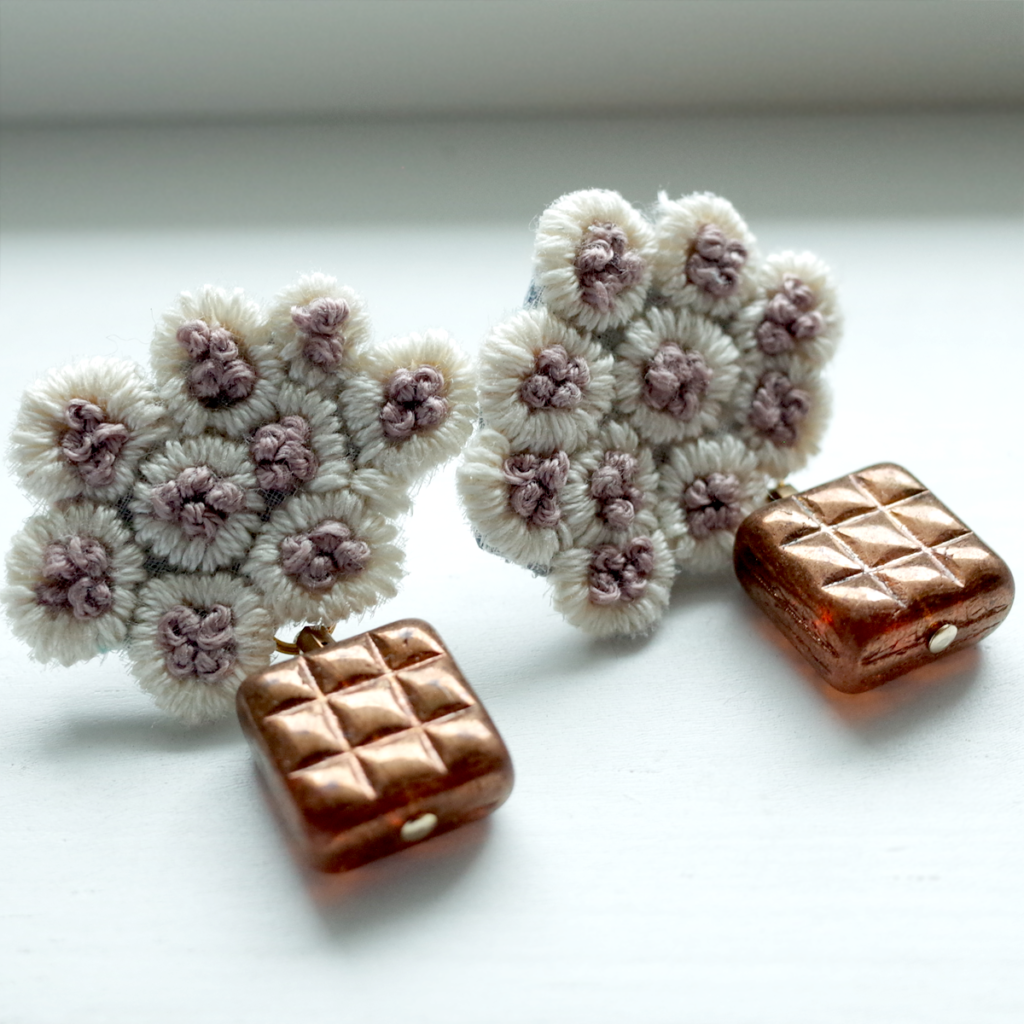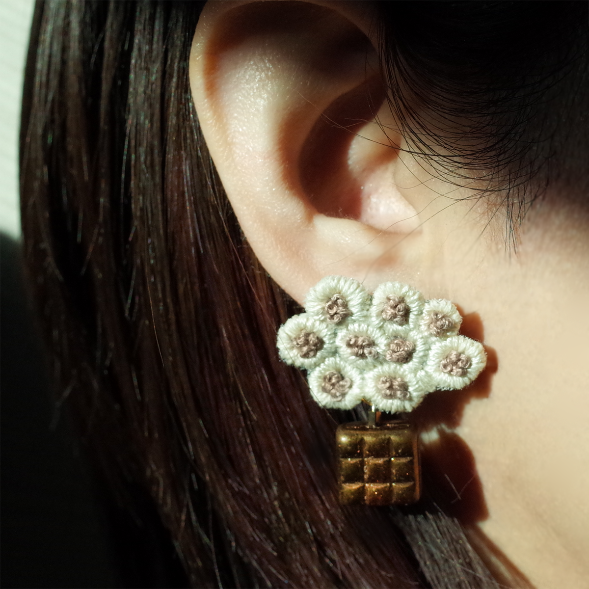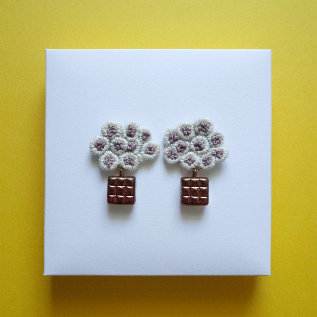 花瓶シリーズ 白と茶色 白にピンクのお花に、茶色のチョコレートのようなビーズを使用しています。ビーズはチェコビーズです。お菓子のようなピアスができました。 ご購入はこちらから(minneのサイトにジャンプします) ACCESSORY一覧へ